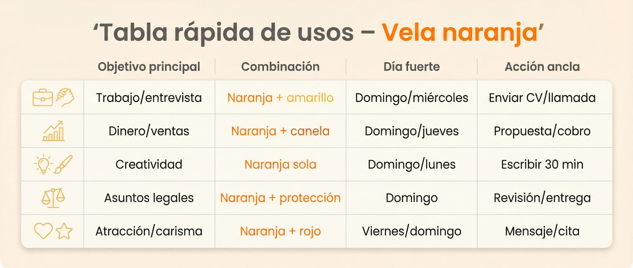 “Enciendo esta vela naranja para activar mi vitalidad y foco en [objetivo]. Veo el siguiente paso [acción] con alegría y decisión. Gracias.”