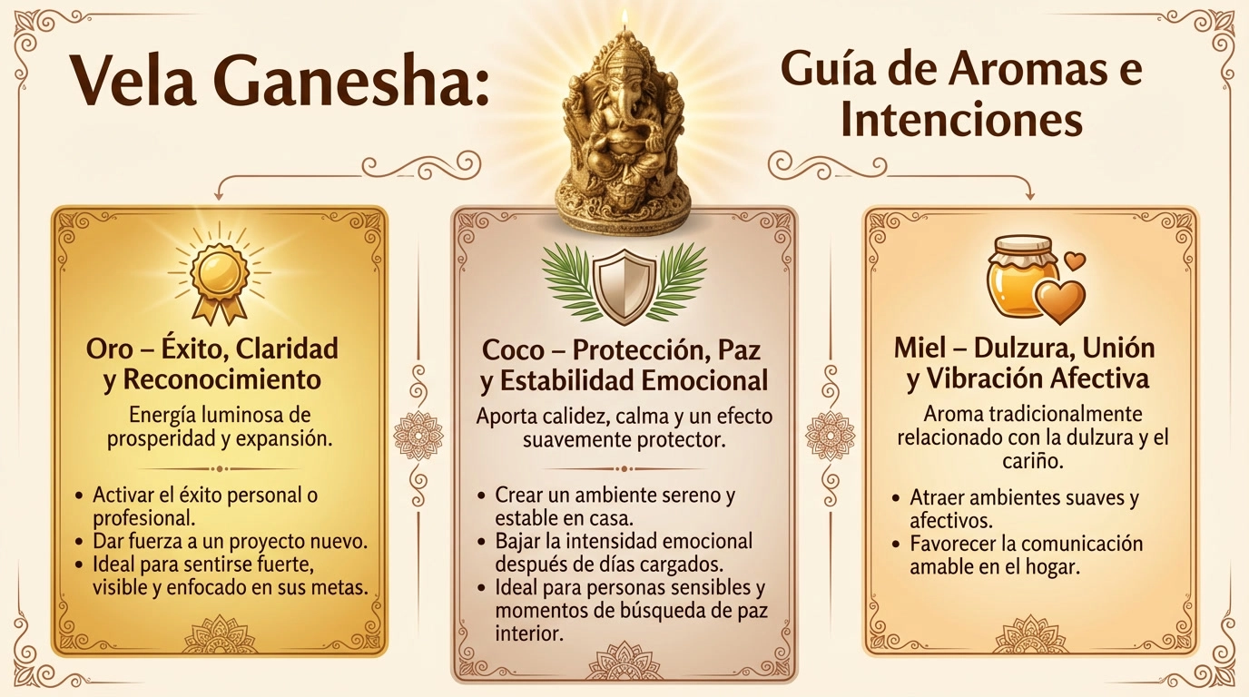 Cada aroma de la Vela Ganesha potencia una energía distinta. Puedes elegir el que mejor se adapte a tu intención o combinar varios si trabajas diferentes áreas de tu vida.