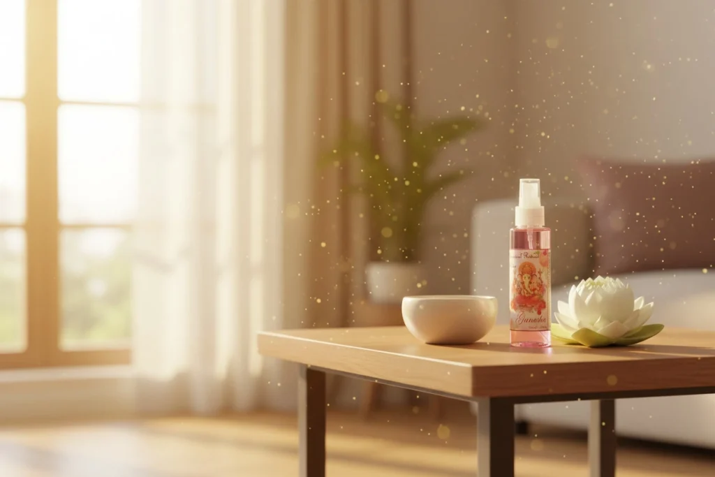 “Imagen de Agua de Ganesha – usos habituales del spray ambiental en entrada, escritorio y rincón de meditación, estilo esotérico profesional.”
