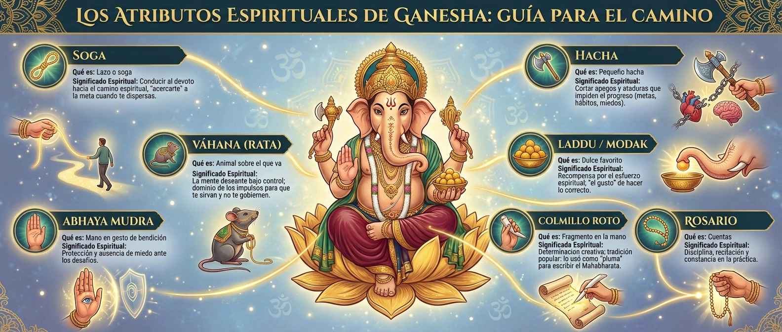 Si quieres “leer” una imagen de Ganesha, fíjate en su cabeza de elefante (auspicio, inteligencia práctica) y en su cuerpo humano de vientre prominente (prosperidad, capacidad de contenerlo todo). Suelen representarse cuatro brazos, y en cada mano, atributos con significado espiritual. Aquí va una guía rápida y útil: