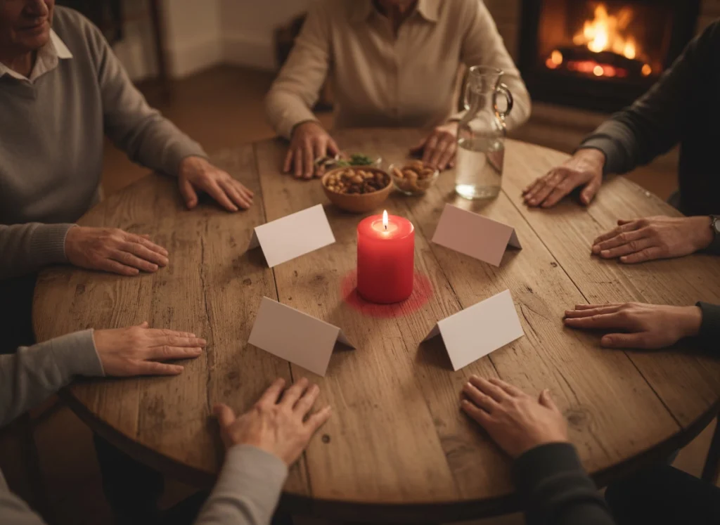 2. Set-up: una vela roja central; alrededor, papeles con los nombres (o símbolos) de las personas.