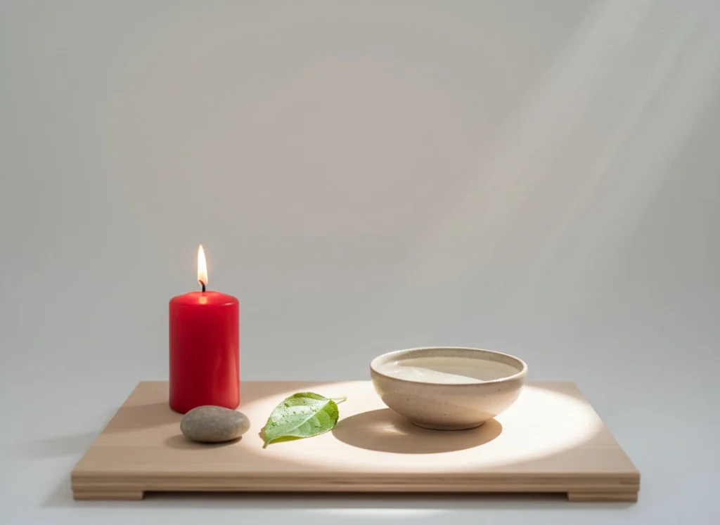 • Altar minimal: plato ignífugo, base estable, un vaso de agua, un objeto simbólico (foto, mineral, carta).
