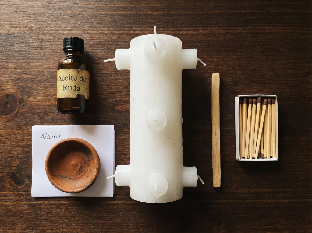 Un toque de aceite de ruda, una petición clara y un espacio ordenado. Si la cosa es grave, serie de tres cada 21 días.